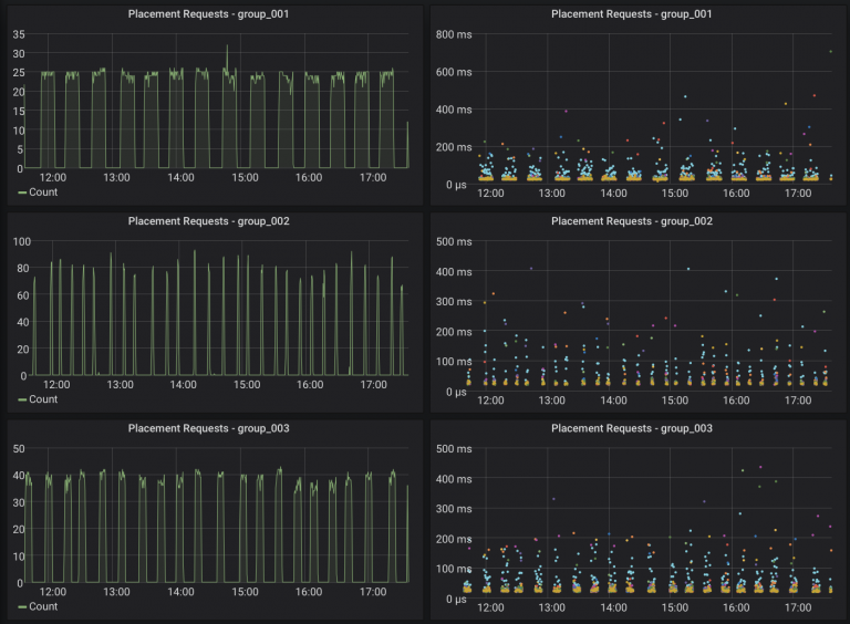 在下图中,你可以看到每个conductor group的Placement请求数。因此,RT周期时间现在只需要15分钟就可以完成,而不是以前的3小时,因为它现在被conductor group的数量划分。