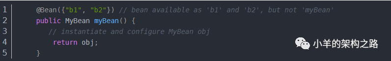 当使用name属性可用时,用于确定bean名称的默认策略是使用方法的名称。但是如果需要显式命名,则可以在注解上使用 name 属性(或其别名{value})。