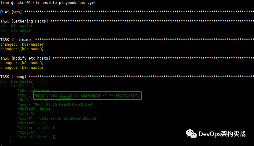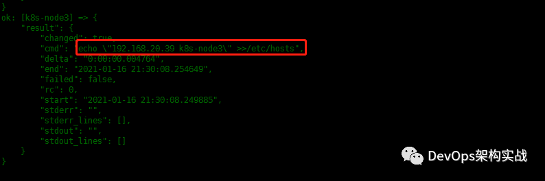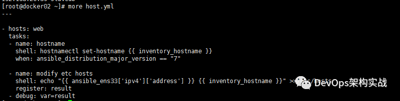 shell: echo "{{ ansible_ens33['ipv4']['address'] }} {{ inventory_hostname }}" >>/etc/hosts