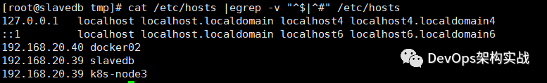 [root@slavedb tmp]# cat /etc/hosts |egrep -v "^$|^#" /etc/hosts