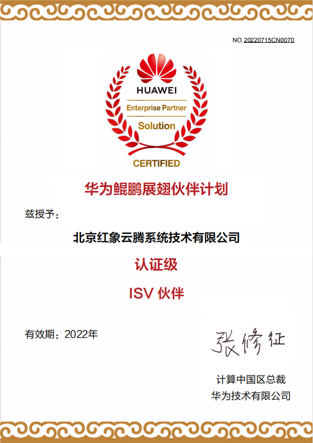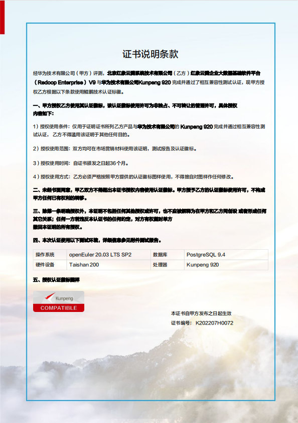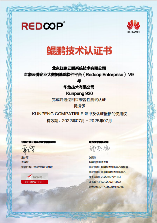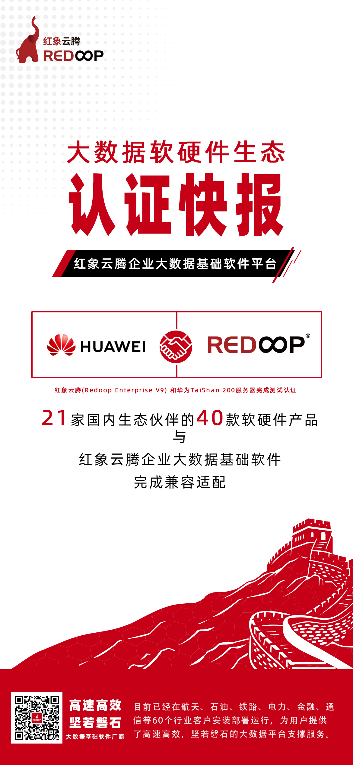 近日,红象云腾与华为工作人员再次联合严格测试,红象云腾企业大数据基础软件平台(Redoop Enterprise)V9完成了与华为技术有限公司Kunpeng 920完成并通过了相互兼容性测试认证,并获取KUNPENG COMPATIBLE 证书及认证徽标的使用权。此次兼容认证,不仅完成了兼容认证工作,还加入了华为鲲鹏展翅伙伴计划,成为认证级 ISV 伙伴。