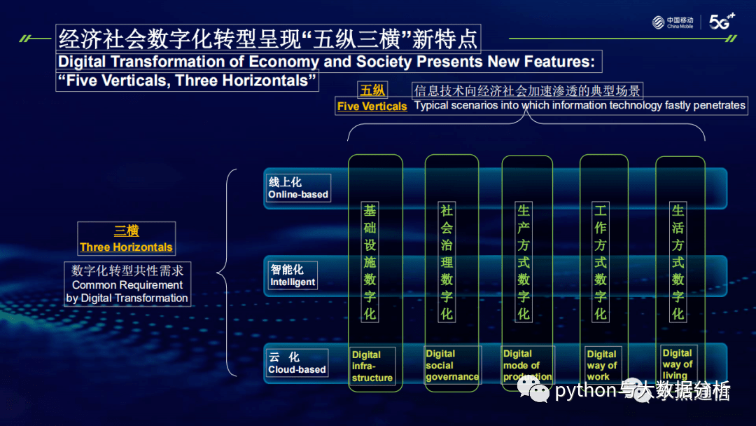 结合当前形势看,经济社会的数字化转型进程正在加速,并呈现出“五纵三横”的新特征。“五纵”是当前信息技术向经济社会加速渗透的五个典型场景。一是基础设施数字化,信息技术向基础设施建设运营全生命周期渗透赋能,使基础设施更加智能、高效。二是社会治理数字化,基于社会化大数据的应用创新和精细化管理决策贯穿于社会治理各环节,加速治理模式由人治向数治、智治转变。三是生产方式数字化,通过优化重组生产和运营全流程数据,推动产业由局部、刚性的自动化生产运营向全局、柔性的智能化生产运营转型升级。四是工作方式数字化,远程办公应用加速普及,线下集中的传统办公模式将向远程协同常态化的新办公模式不断演进。五是生活方式数字化,数字生活应用沿生活链条不断延展,从满足规模化、基础性的生活需求向满足个性化、高品质的生活体验升级。“三横”是当前经济社会数字化转型的三大共性需求。随着疫情下经济社会数字化进程加速,线上化、智能化、云化平台逐步成为全面支撑经济社会发展的产业级、社会级平台,并呈现出横向扩张延展的新特征。一是线上化,永续在线打破物理空间和网络空间的边界,拉动连接规模持续增长;二是智能化,全量数据挖掘重塑资源配置和生产运营逻辑,成为关键生产要素;三是云化,云基础设施由“中心”向“中心+边缘”结合的立体布局转变,成为产品服务交付的基本载体。