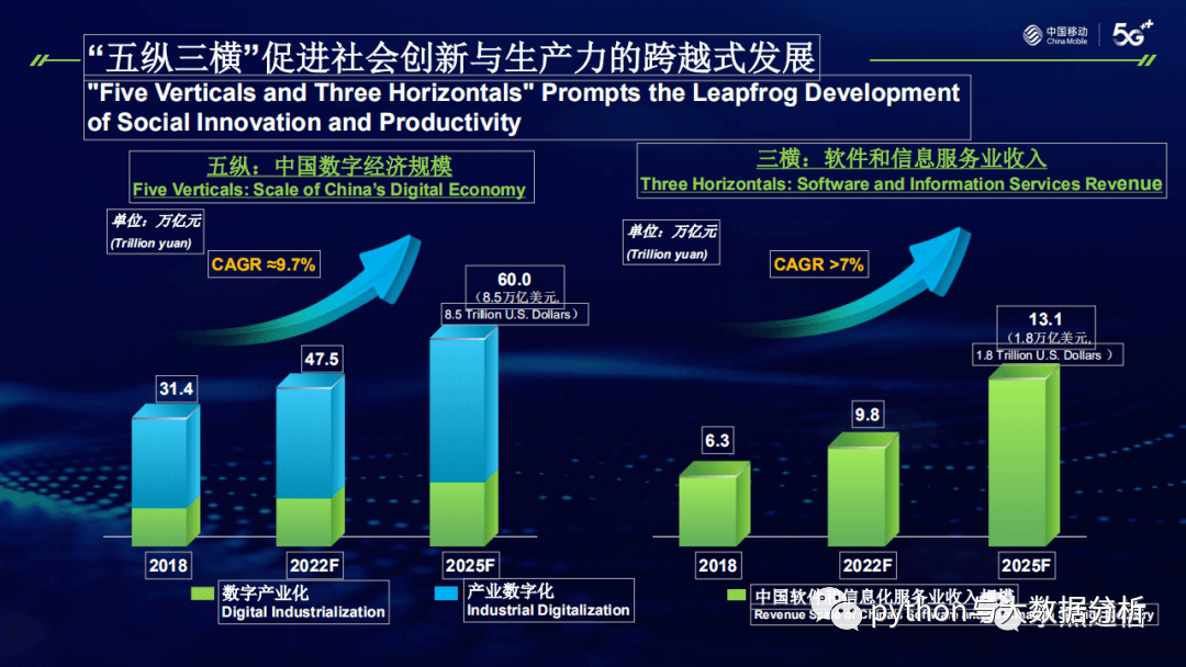 整体来看,“五纵三横”体现了信息技术正由局部相关领域向经济社会各领域广泛深入扩散,将进一步促进社会创新水平的整体跃升和生产力的跨越式发展,也将开启信息通信业发展的新阶段。预计到2025年,在“五纵”的推动下,中国数字经济规模将达到60万亿元;而“三横”将带来国内软件和信息服务业收入规模达到13万亿元。