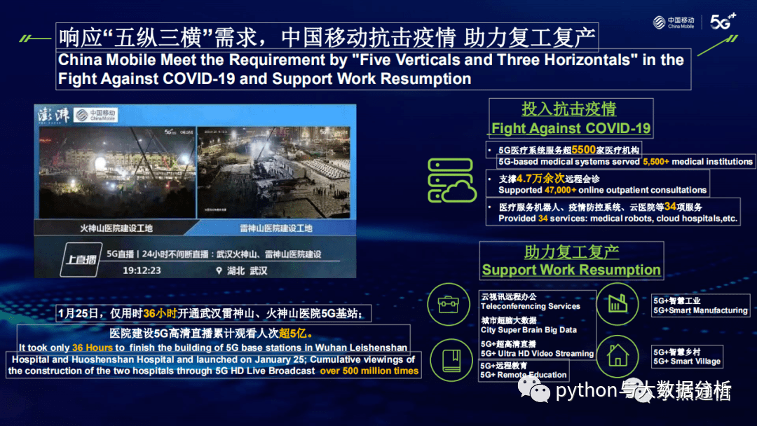 疫情爆发以来,中国移动积极应对,第一时间组织专业力量,全力以赴、多措并举投入到抗击疫情、助力复工复产的各项工作中。在抗击疫情方面,1月25日,中国移动仅用36小时率先在武汉开通了雷神山和火神山5G基站,实现对两处医院建设的5G高清直播,累计观看超5亿人次;5G远程医疗系统服务了全国超5500家医疗机构,支撑开展了4.7万余次远程会诊,并提供医疗服务机器人、疫情防控系统、云医院等34项服务;积极支撑“国家远程中心会诊平台”建设,承担新冠肺炎重症、危重症患者国家级远程会诊任务,为战疫一线保驾护航。在复工复产方面,中国移动充分发挥信息化优势,提供“云视讯”远程办公、城市超脑大数据、5G+超高清直播等服务,助力政府和企业高效运转;5G远程教育助力校园复教,实现学生“停课不停学”;5G智慧工业作业区域实现无人化、少人化,助力工业企业加快复产;5G智慧乡村助力疫情防控保平安,健康复工促生产。