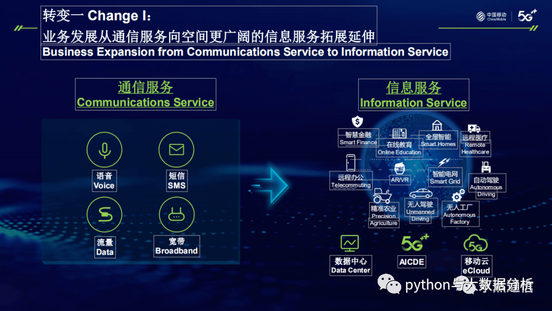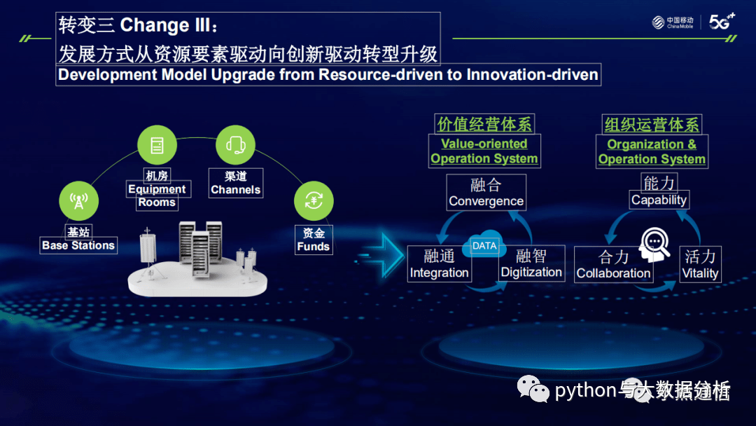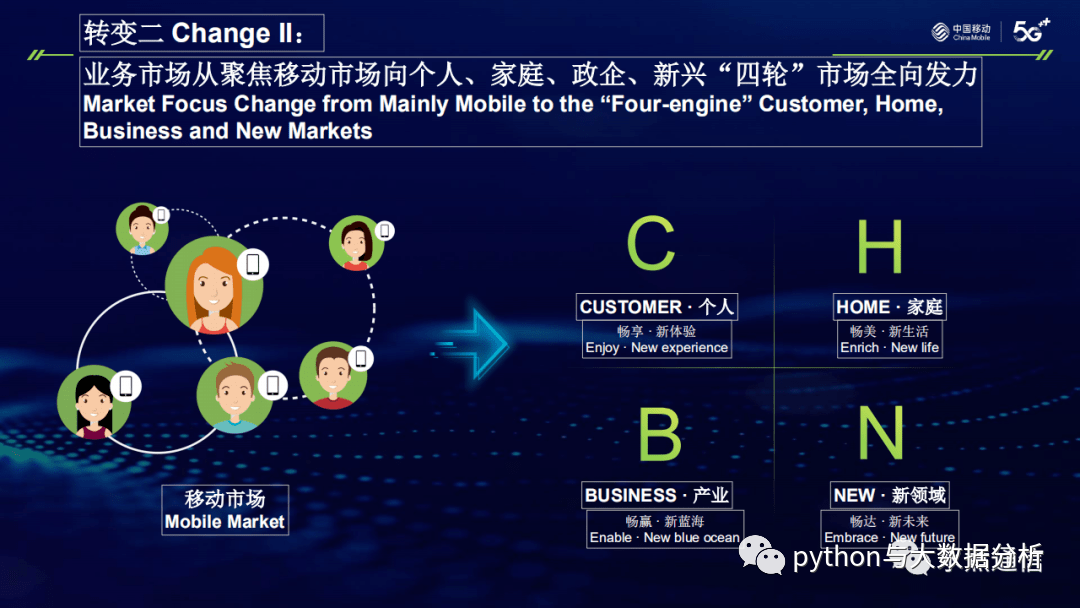 这一蓝图的总体方向可以进一步概括为“三个转变”。一是业务发展从通信服务向空间更广阔的信息服务拓展延伸。中国移动将把握新一代信息技术深度融入经济社会各个领域的契机,加快转变业务模式,以5G、云和数据中心为关键抓手,着力构建支撑数字经济发展的基础底座,实现从传统通信服务向空间更广阔、价值更高的信息服务延伸,拓展十万亿级信息服务蓝海空间。二是业务市场从聚焦移动市场向个人、家庭、政企、新兴“四轮”市场全向发力。顺应数字化应用向更广领域延展趋势,以个人、家庭、政企、新兴CHBN四轮市场的数字化产品和品牌构建为核心,加快转变业务范畴,优化收入结构,拓展企业新的增长点,不断满足经济社会转型需求和人们数字化美好生活需要。三是发展方式从资源要素驱动向创新驱动转型升级。面对需求多样的信息服务市场,创新驱动成为企业唯一选择,通过构建基于规模的“融合、融通、融智”价值经营体系,实现资源优势向竞争优势的高效转化,通过打造高效协同的“能力、合力、活力”型组织运营体系,推动组织、机制和战略的有效协同,实现生产力和生产关系的长期动态匹配。