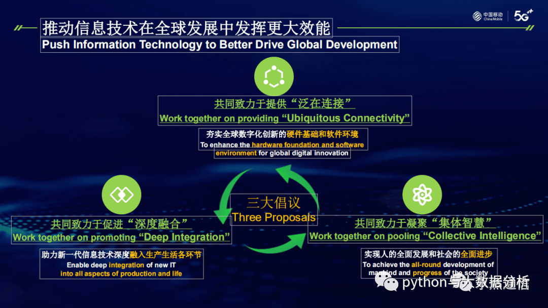 孤举者难起,众行者易趋。为了推动信息技术在全球发展中发挥更大效能,中国移动提出以下3点倡议。一是共同致力于提供“泛在连接”,加快5G等新型信息基础设施建设,推动标准统一、互联互通、资源统筹、合理分配,共同夯实全球数字化创新的硬件基础和软件环境。二是共同致力于促进“深度融合”,共同探索信息技术赋能经济社会转型的发展路径,共创数字化应用产业生态,培育新产品、新服务、新业态,共建行业标准、共研创新技术、共推应用示范,助力新一代信息技术深度融入生产生活各环节。三是共同致力于凝聚“集体智慧”,面向长远,共同携手推进下一代信息通信基础理论与核心技术创新突破,构建万物互联、空天一体、人机交互的数字社会网络空间,充分汇聚提炼社会全量数据的集体智慧,实现人的全面发展和社会的全面进步。