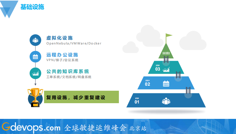 1、基础设施,可复用的基础设施,比如虚拟化设施、远程办公设施、公 共 的 知 识 库 系 统等等,可以帮助减少重复的建设,提高团队效率。