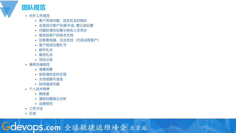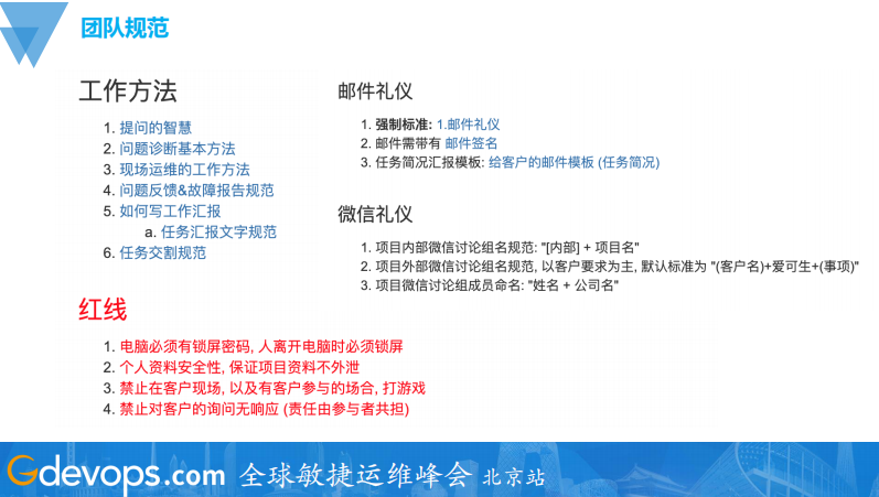 2、团队规范,不讲武德的前提下必须要有规范,比如对外的工作规范、通用沟通规范、个人技术修养、工作方法、邮件礼仪、微信礼仪、绝对不能犯的红线。
