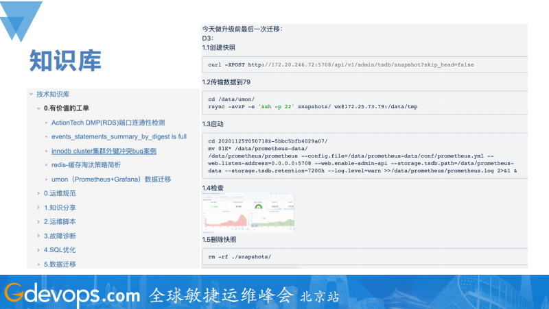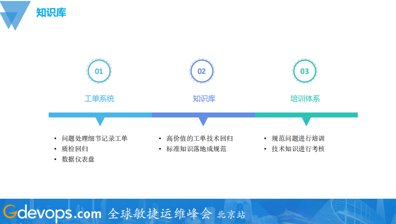 4、知识库,运维是团队的知识库,支持团队持续前进和成长。知识库是一个流程,将工作细节记录下来,领导检查有无技术披露、更高效的方式,或高价值工单来做技术回归,再整理整合到知识库落成一个标准规范,将规范再拿出来说是一个培训,或是一个考核的题目,进行分享学习。