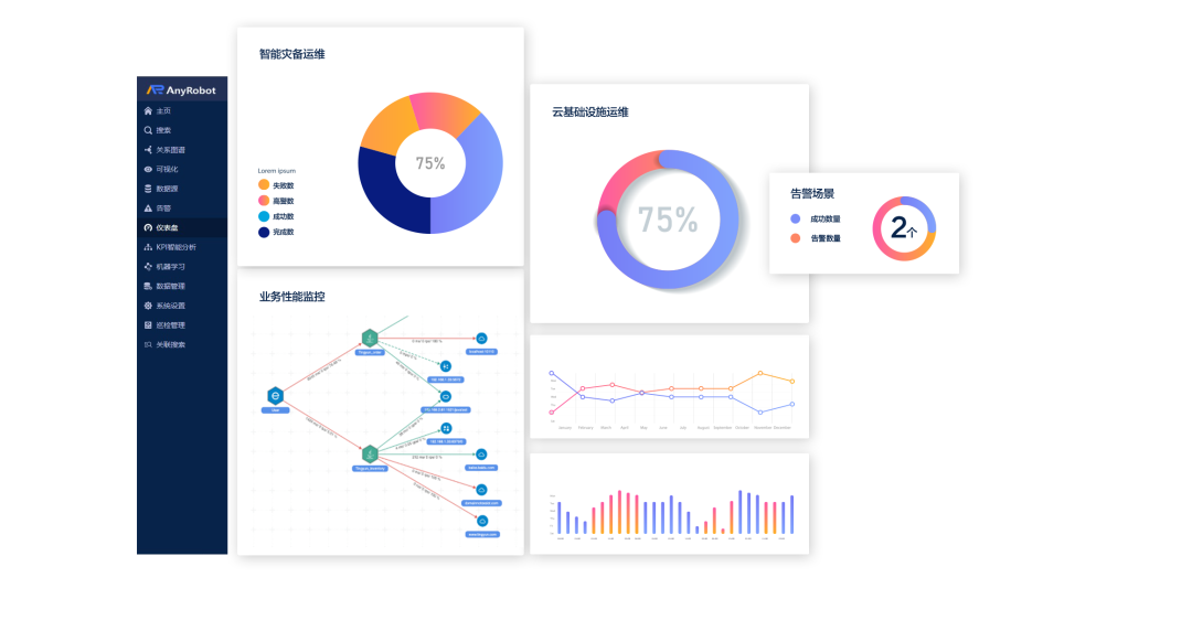 面对日渐复杂的混合云架构,针对日志留存难、系统运维排障效率低等诸多运维痛点,AnyRobot基于云原生架构,将IT环境中产生的海量机器数据进行统一管理,并借助大数据、机器学习、人工智能等先进技术,实现机器数据的统一搜索与利用,帮助企业实现IT资源趋势预测、统一监控运维、故障快速定位、业务洞察分析。同时,基于实际运维场景,打造了智能灾备运维、云基础设施运维、业务性能监控等实用性超强的方案,全面提升运维生产力。