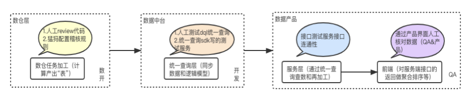 目前数据质量保障的分工和测试策略如下图所示,从数仓层-->数据中台-->数据产品,数仓主要由数开保证质量,依靠code review、配置表的稽核规则、以及一些数据比对工具;数据中台主要依赖于统一查询服务进行接口测试保障;数据产品层,依赖QA的应用功能测试及人工核对指标。