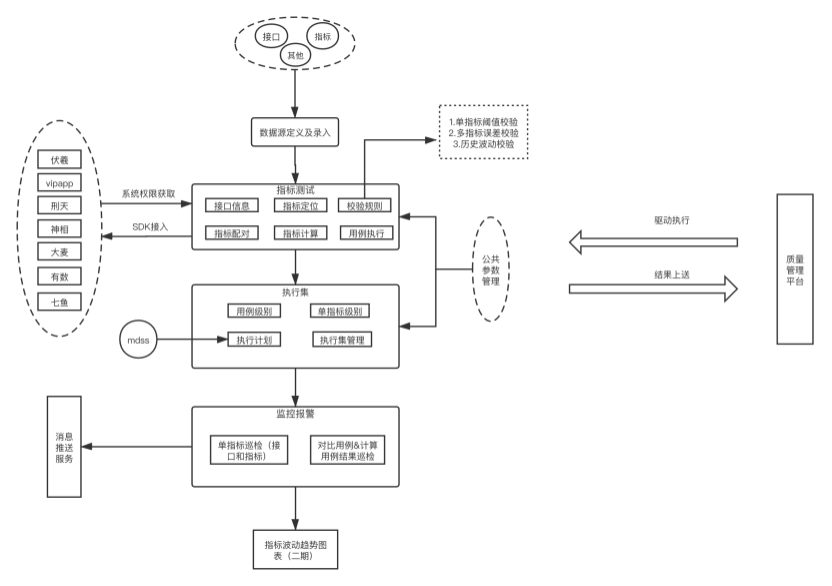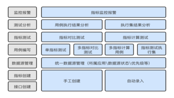 提供指标的对比测试以及指标运算测试,支持在模型层和服务层对指标提供测试能力; 提供版本迭代周期内数据指标的一键回归能力,具备上线前质量卡点的能力; 提供线上巡检能力(用例维度、指标维度); 将指标测试提前至接口和指标刚定义好的阶段与开发工作并行,测试可提前至接口和指标已定义好后,与开发工作并行,缩短测试周期及整个项目周期(TDD数据试点)。