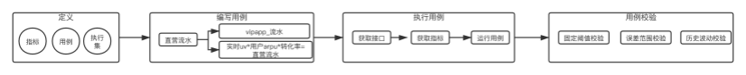 Step 1. “定义”: 指标(包括用例、执行集),形成指标测试及回归视角的接口定义集合和指标定义集合。 Step 2. “编写用例”: 从全域数据产品为出发点,不区分应用,梳理不同应用中同个指标(同模型查询/不同模型查询)的对应关系,进行用例编写。 Step 3. “执行”: 通过指标测试平台获取各数据源(统一查询、数据产品的接口)获取指标数据,运行用例。 Step 4. “校验”: 用预制的规则对指标数据校验,包含固定阀值校验、历史波动校验、指标关系校验(A指标 = B指标/C指标)等。不同接口/模型间对比:用于测试相同指标在不同(接口或模型),是否存在数据不一致的问题。不同环境对比(线上和线下):用于底层重构、变更后的回归测试,来发现测试版本和线上稳定版本的数据不一致的问题。