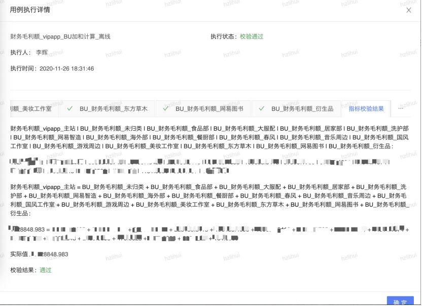 数据指标运算 在平台初期调研需求的阶段,V产品说,我每次核对指标,有一项是各BU财务毛利额之和要等于总的财务毛利额的数值。将近二十个BU数据,只能求助计算器,一不小心还容易看错行,将近二十个BU的数据,每次回归需要加和做运算比对的手工工作量很大。 再来看下,指标平台的一键执行回归后的结果图(11月25号财务毛利额离线数据):