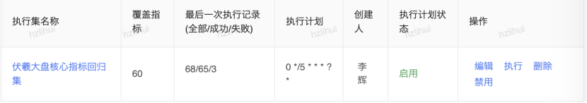 线上环境和测试环境数据对比,应对模型重构的场景(online<---->test) 因为严选数仓这边没有测试环境,数据产品版本中经常有模型重构的场景,需要比对版本模型跟线上模型数据的一致性。用例可以区分online环境和test环境,进行重构场景的数据比对。 创建执行集,执行线上巡检 目前有两种巡检方式,一般离线数据很稳定,执行巡检的频率不用很高。只有单指标用例(指标监控)需要较高的频率去跑,以便发现500的接口,以及卡住不能及时产出的指标(一般展示为0或者null)。