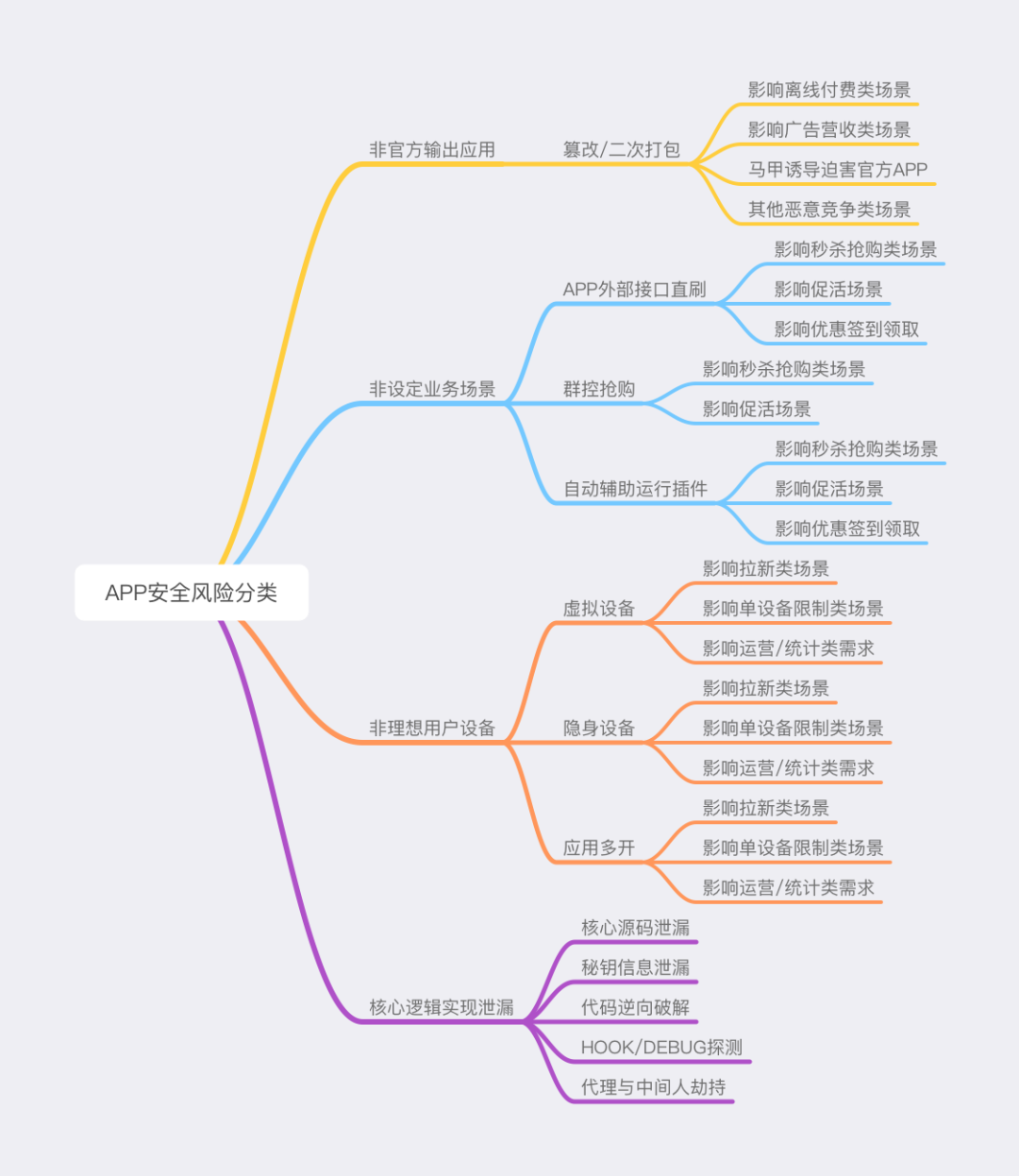 秒杀场景:大量用户在特定时间点,通过点击抢购来秒杀优惠商品,从而营造一种紧迫而有噱头的营销场景,但如果能通过非法手段自动抢购、甚至提前开始刷接口抢购,那就彻底破坏了业务的玩法,这就是一种不安全的运行模式。 常用的用户拉新场景:新客获取成本高达200左右,所有产品的拉新投入都蛮高,如何获得真正的新用户而不是羊毛党也是拉新必须处理的事,一般而言,新设备+新账户是新用户的基本条件,但新账户的成本其实不高,大部分是要靠新设备来识别的,但如果能通过非法手段不断模拟新设备,那拉新投入获取的可能大部分都是无效的羊毛党,这也可看做是一种不安全的运行场景。 甚至还有二次篡改,构建马甲APP等各种场景。