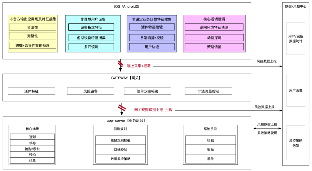 端是信息的来源,负责信息采集上报,是安全体系建设的基石,所以端上采集信息的真实性、为完整性至关重要,同时端上也可以执行部分风险低,但收益高的拦截略,比如对于一些已经侦测到的马甲包,在上报用户信息之后,可以选择Crash,对于一些机器点击类的签到、秒杀场景,可以主动拦截请求,降低带宽压力。 网关是第二层,一般处理一些具体规则类的拦截与信息采集,比如有些简单的规则检验,Header里是否携带必备的校验字段,如多开标识、模拟器标志等,如果携带则可以在这一层直接拦截,并沉淀到数据中心,既保证了信息的采集,又能减轻业务后台的压力,尤其对于一些秒杀类的场景非常有效。 业务后台跟数据平台可以一起看做第三层,负责更复杂的模型建设跟业务落地,比如在什么样的节点,才有什么样的策略,比如在组单的时候,业务后台可根据风控侧的判断决定用户的优惠力度等。