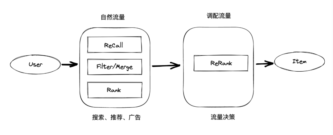 真实的流量分发场景,用户看到最终的Item(广义表述,可以是商品、内容、活动)呈现,历经的Pipelin包括:召回→过滤/合并→精排→重排。流量决策落地在重排阶段,同时流量决策需要先回答两个问题: