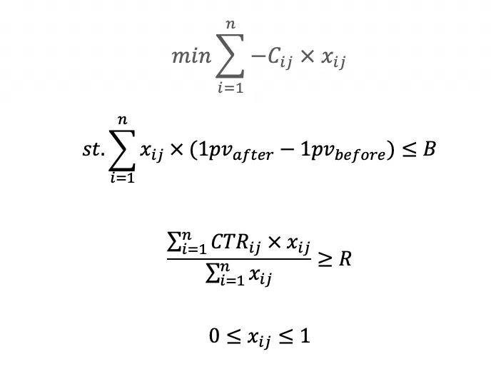 在我们的流量决策场景里,将重排问题转化为预算花费问题(类似程序化广告投放),预估每个位置的千展价值CPM,扶持商品的位置上拉定义为预算消耗,重排问题定义目标如下: