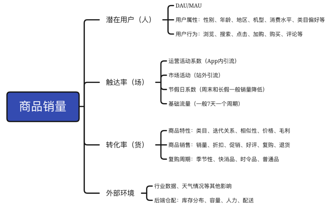商品的销量主要跟曝光量和转化率相关,因此销量预测模型采用的主要特征包括潜在用户、触达率、转化率、和特定外部等相关因素,更具体的描述见下图4。