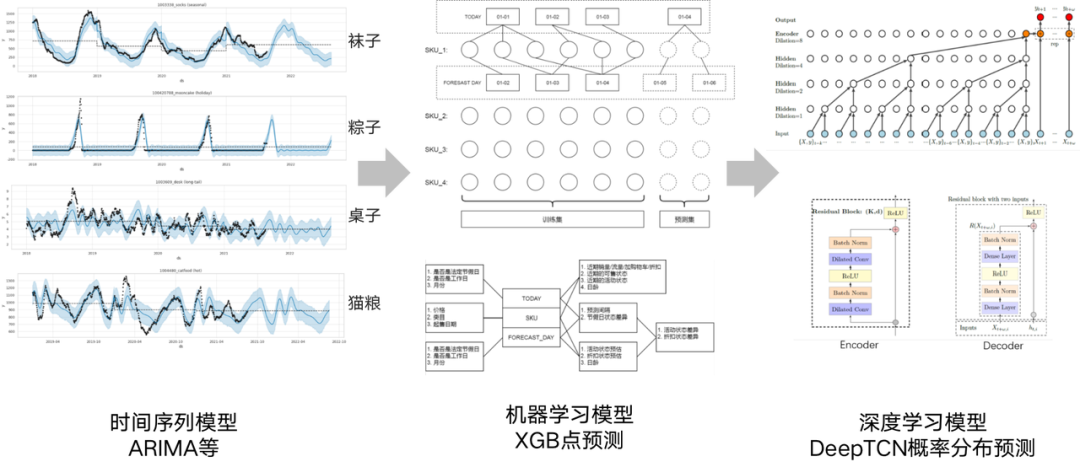 预测模型经过了多个版本的迭代,主要可以分为时间序列模型、基于XGBoost或GBDT的树模型、和基于深度学习的DeepTCN概率分布模型。对于波动性、趋势性比较稳定的商品,时间序列模型ARIMA或其优化变种可以解决。但是线上销售,往往影响因素非常多且复杂,一般趋势没那么稳定,因此树模型可以充分利用各种特征,对历史数据进行训练,发挥很好的作用。深度模型的优势是特征工程简单,且天然可以输出销量的概率分布。根据我们的经验,树模型的准确率较高,且可解释性相对较好,因此实操中大部分情况使用的还是树模型。