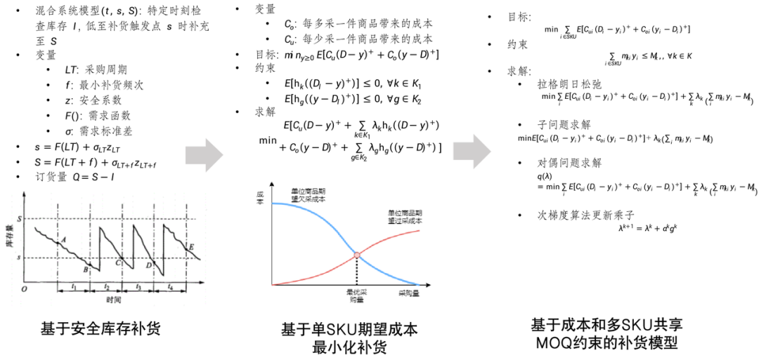 基于单SKU期望成本最小化补货:定义单个sku的过采和欠采成本,基于过采量和欠采量的约束下,最小化每个sku的期望总采购成本。第一个约束是和欠采相关的,可以表示缺货量不超过某个值等。第二个约束是和过采相关的,可以表示最大补货量(或者库转)不超过某个值。过采成本和欠采成本,是包含具体子项成本的,如过采成本子项里会包含:运费成本,仓租成本,资金持有成本,商品贬值成本。