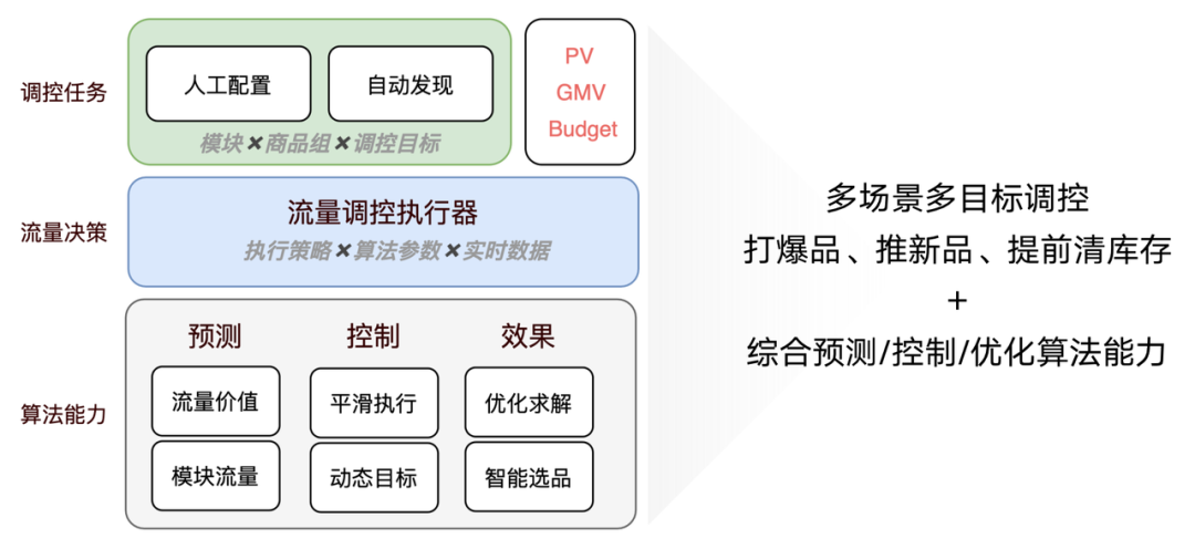 流量调控系统综合了预测算法、自动控制和运筹优化等算法能力,系统本身可满足多场景多目标的需求,如打爆品、推新品、提毛利等,提前清库存只是流量调控系统的一个应用场景。在这个场景下,首先根据销量预测和策略得到有风险且要加权的商品,接着计算系统接入模块的曝光流量预估,再选择转化效率预估较低的流量进行导流。并进行实时监控和自动控制,当导流效率下降则停止,一般提前清库存场景的转化效率下降会比较快,所以只能做到微调。