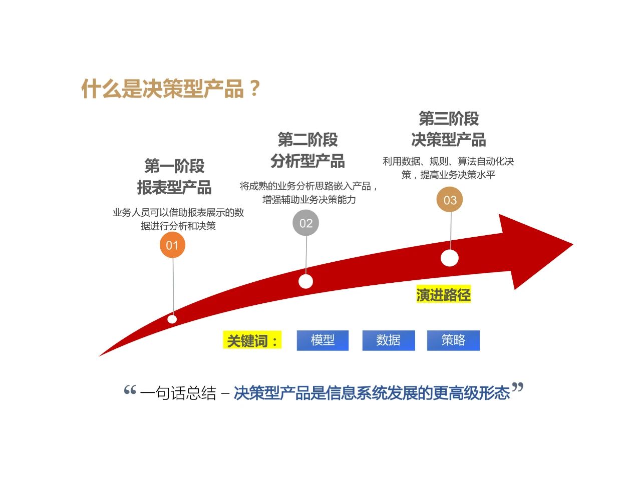 大数据技术的成熟及其在企业决策流程中的广泛应用,让基于数据的各类业务产品在企业产品矩阵中的地位越来越重要。此类业务产品按照对于业务决策支持能力的强弱,可以分为三个发展阶段: