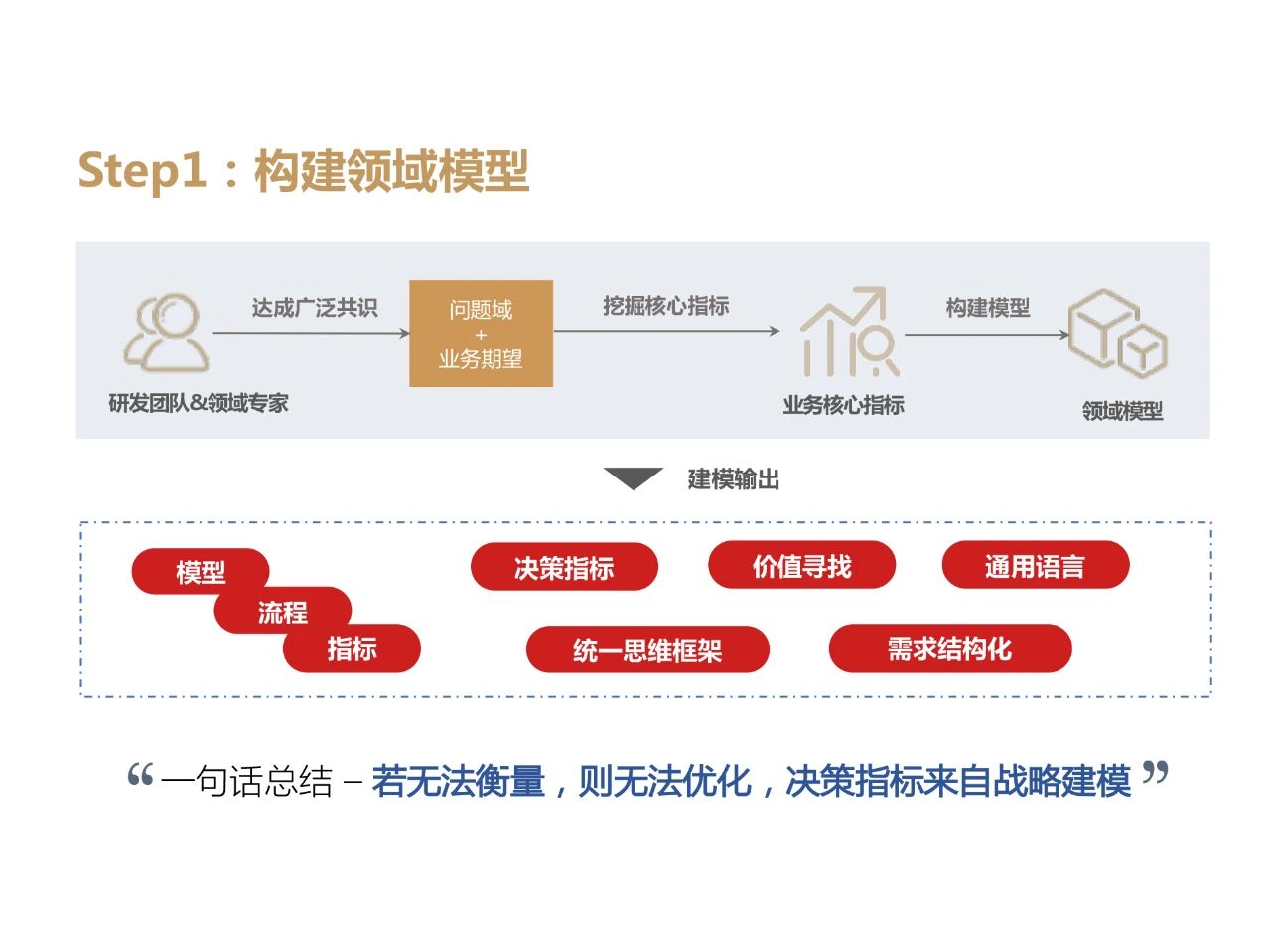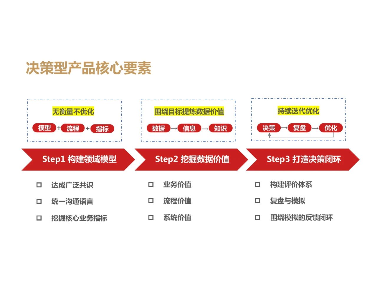 我们认为,决策型产品的核心要素有三个:模型+数据+策略。与此相对应的,为了能够让一个决策型产品成功落地,主要需要做好三件事:- 构建领域模型,即要充分抓住决策型产品所解决的真实的业务问题,构建精准且可扩展的领域模型;