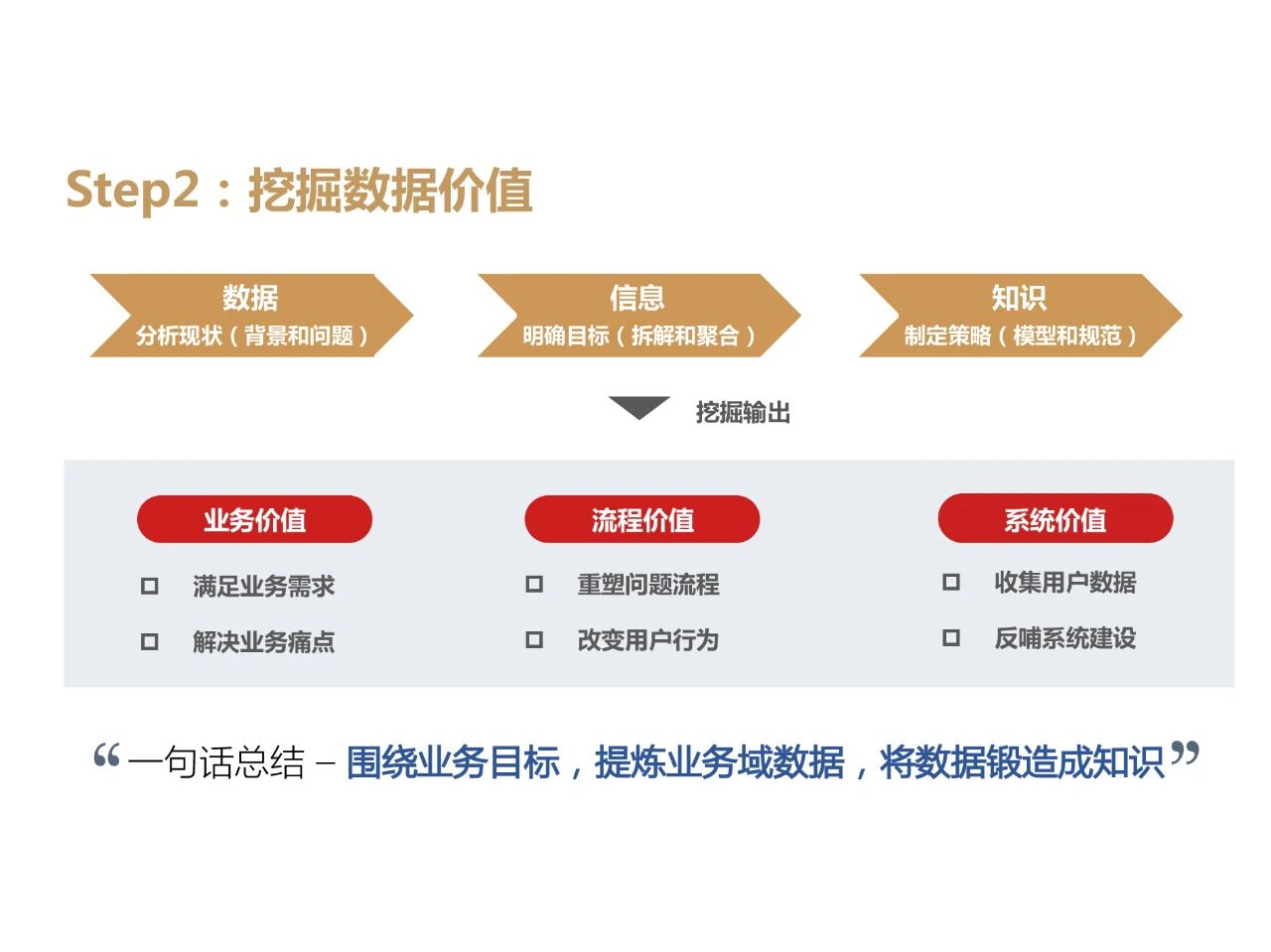 - 挖掘数据价值,即要从业务、流程、系统等各个层面挖掘数据价值,以数据驱动业务决策;