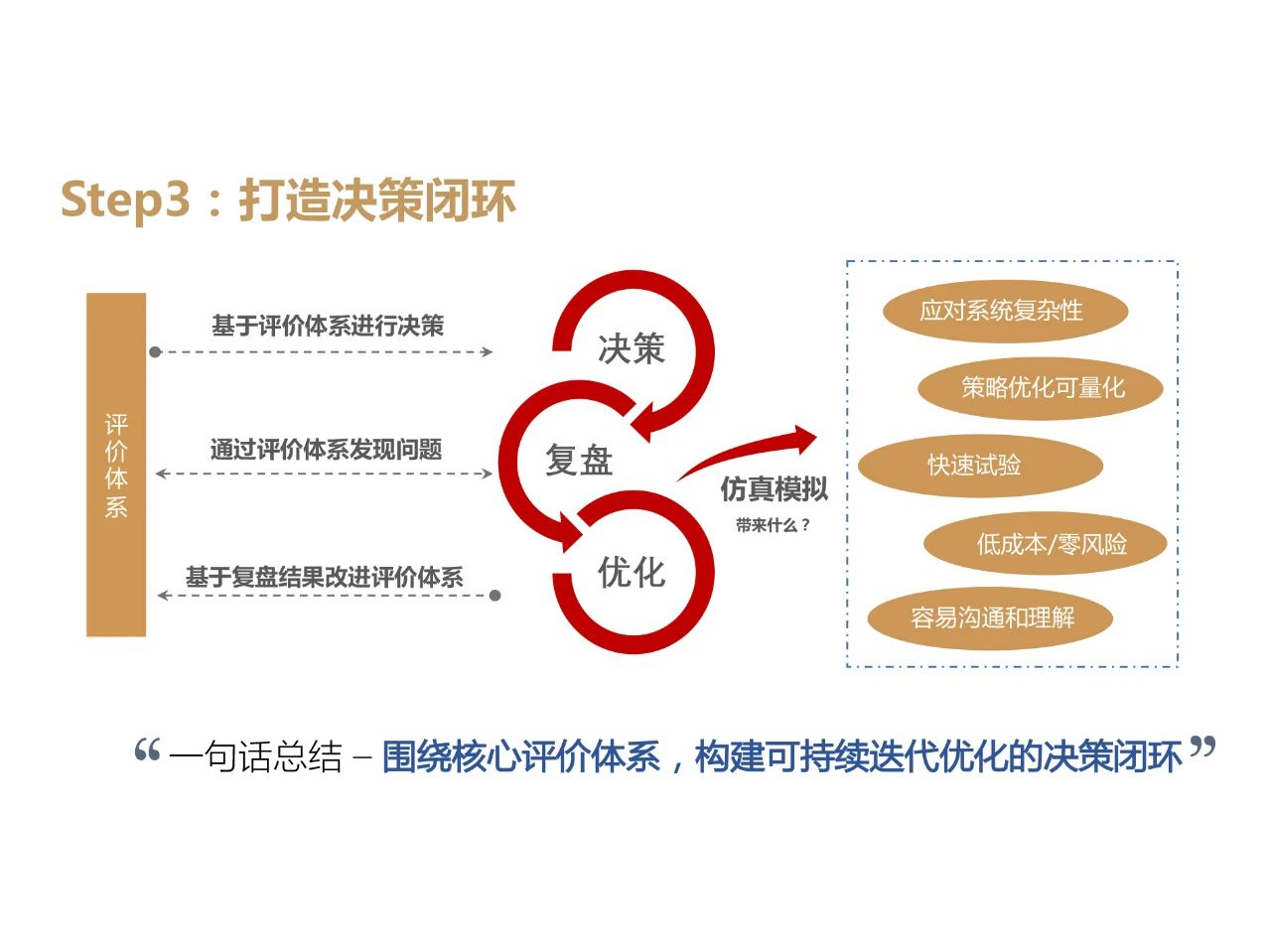 打造数据流转闭环、反哺系统建设是决策型产品发展历程中的高级形态。当前我们使用的多数内部决策型产品基本还处于辅助决策的状态,这里的“辅助”不仅仅指系统对于业务来说,是一种数据分析与计算的工具,不具有完全决策能力,也表示对于产品本身而言,还缺乏一种自我迭代机制,用户的行为数据还未实现反向输入或分析,产品的更新与进步仍然需要依赖于用户主动的自我意识,导致产品品质与使用者的专业素质关系绑定很深。反向分析用户行为数据的过程其实是一种对用户已有经验知识的逆向解析,目前大多数情况下,我们通过人为尽可能地广泛收集用户工作方法与经验,将用户通过经验形成的知识解构为信息和数据,再嵌入到产品中供系统识别和使用。这样做的缺点在于往往受个人偏好的影响较大。智能决策型产品则需要具备自我学习能力,可以基于更多角度的、更深度的、更实时的信息和知识进行解析和复盘,获得新的知识与技能,持续优化决策。此时,决策型产品便完成了正向“数据分拣-信息聚类-知识架构”和逆向“知识解构-信息转化-数据捕捉”的完整数据闭环。这也是决策型产品设计的第三大核心“打造决策闭环”的前提。决策型产品的最终目标,是能够实现自动化决策,取代业务人员日常决策的工作。实际上,实现自动化决策本身其实并不难,难的是如何实现一套可持续迭代优化的自动化决策系统。我们把这项工作称为打造决策闭环,即实现“决策→复盘→优化→再决策”的闭环。不难理解,只有完成了决策闭环的构建,才算真正意义上实现了自动化决策。进一步,通过一轮轮决策闭环的迭代优化,完善策略,强化算法,才能发挥决策型产品的价值,将业务人员从日常的决策工作中解放出来。5.1 构建评价体系