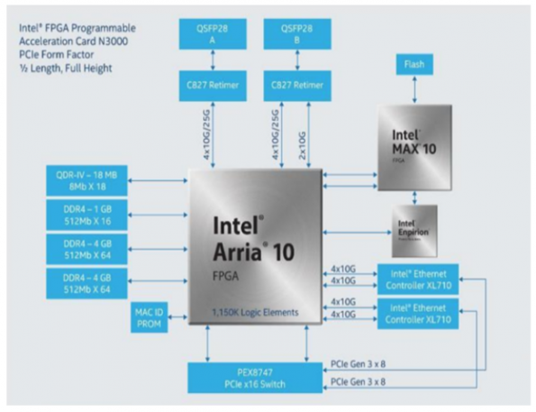 从图3可以看出,N3000的主要组件包括Intel Arria®10 FPGA、双Intel以太网聚合网络适配器XL710、Intel MAX®10 FPGA基板管理控制器(BMC)、9 GB DDR4、144 Mb QDR-IV。它可以支持10Gbps/25Gbps接口的高速网络和PCIe*Gen 3×16的高速主机接口。