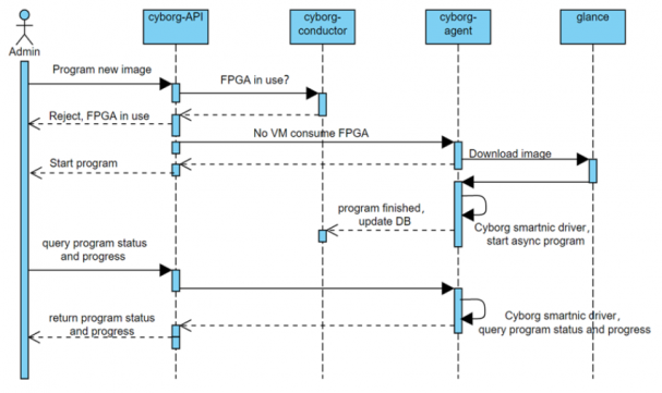 使用Cyborg,可以通过与Nova和Placement交互来使用加速器引导服务器,并支持使用调度加速器的批引导服务器。用户可以在服务器端使用这些设备进行FPGA编程,通过GPU进行图像处理等。还可以通过热插拔和非热插拔设备将加速器绑定和解除绑定到现有服务器上,保证了加速器的方便使用。图1是启动服务器时Nova和Cyborg之间的交互流程。