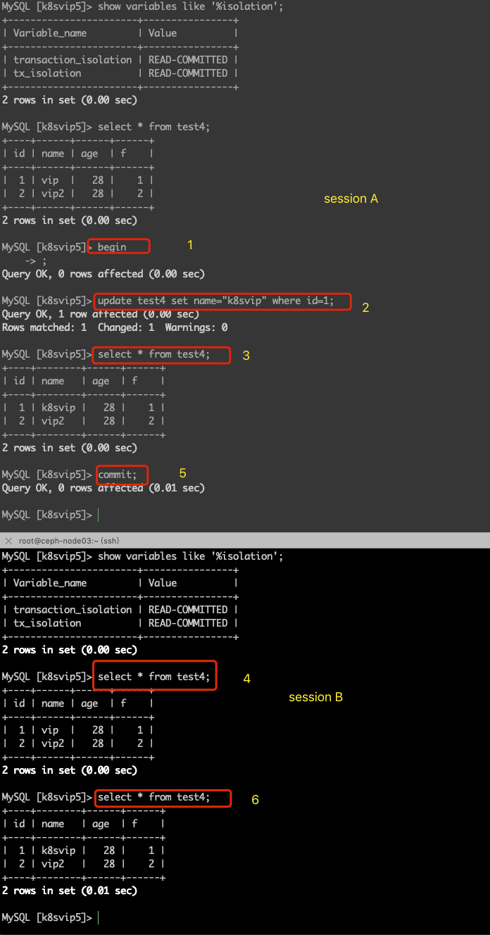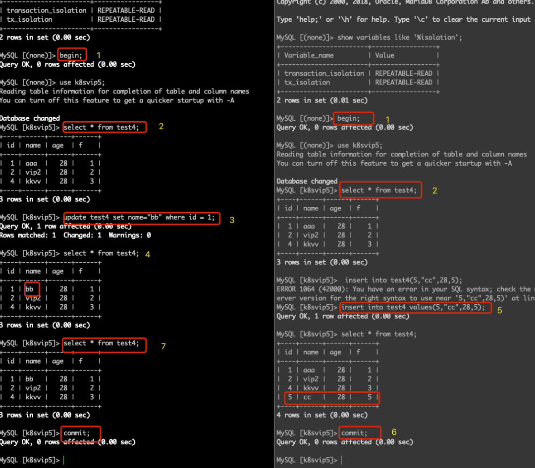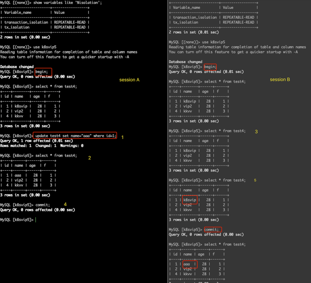 | 1 | 1. begin; 2. update test4 set name="k8svip" where id=1; 3. select * from test4; | session A 事务中更新数据,并未提交事务 | |