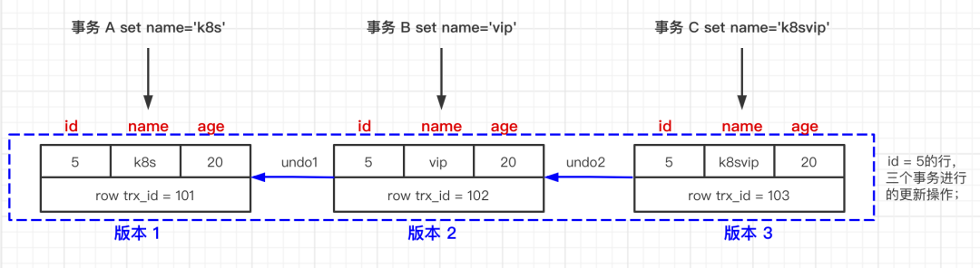 为了解决读提交、或者说是为了实现可重复读,MySQL 采用 MVCC(多版本控制)的方式来解决可重复读问题,在数据表中看到的一行记录可能实际上有多个版本,每个版本的记录除了数据本身外,还要有一个版本字段,记为row trx_id,而这个字段就是用来记录事务的ID,在事务开始的时候向事务系统申请,按时间顺序递增。