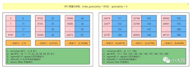•跳数索引一共支持四种类型:minmax(最大最小)、set(去重集合)、ngrambf_v1(ngram 分词布隆索引) 和 tokenbf_v1(标点符号分词布隆索引),一张数据表支持同时声明多个跳数索引