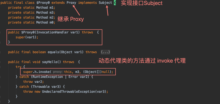 可以看出生成的动态代理类,继承了 Proxy 类,然后对 Subject 接口进行了实现,而实现方法 sayHello 中实际调用的是 ProxyInvocationHandler 的 invoke 方法