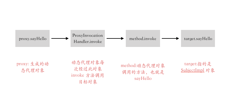 方法调用,invoke 方法通过反射调用被代理对象(SubjectImpl)方法(sayHello)无实现类接口则是仅对 InvocationHandler#invoke