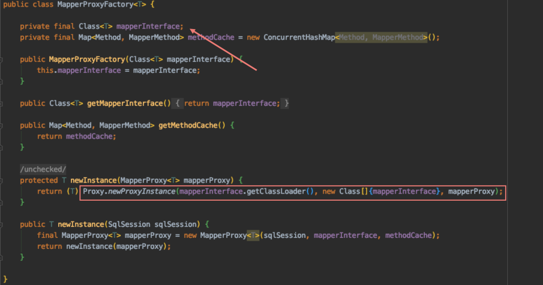 看看 Mybatis 底层它怎么实现的动态接口代理,小伙伴只需要关注标记处的代码即可
