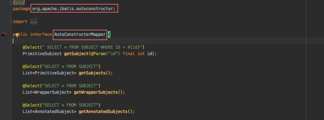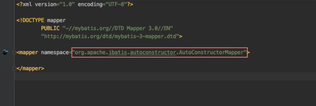 为了方便大家理解,通过 Mybatis 源码提供的测试类举例。假设已有接口 AutoConstructorMapper 以及对应的 .xml 如下