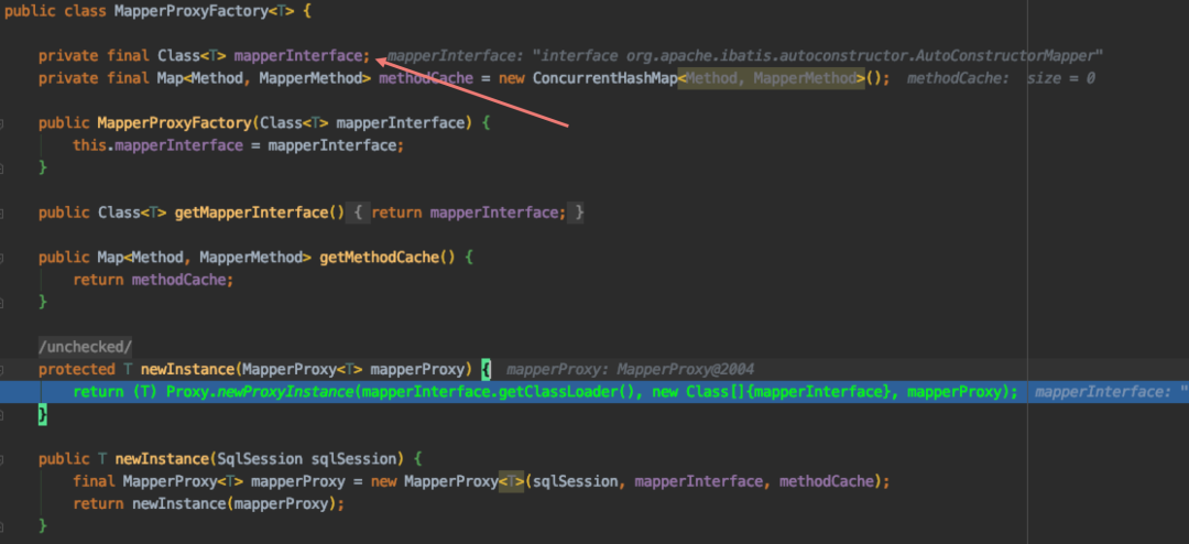 和我们的 Demo 代码很像,核心点在于 mapperInterface 它是怎么赋值的