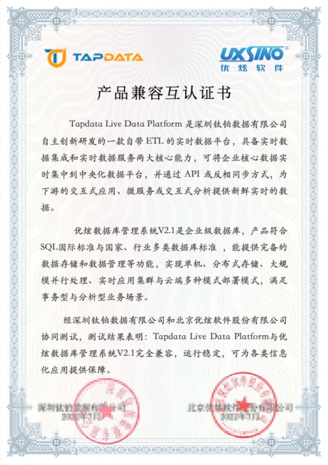 近日,优炫数据库管理系统(优炫数据库,UXDB)与Tapdata实时数据平台(Tapdata Live Data Platform, Tapdata LDP)完成产品兼容互认证,通过严格测试,结果证实优炫数据库管理系统 V2.1与Tapdata实时数据平台完全兼容,运行稳定,可为各类信息化应用提供保障。