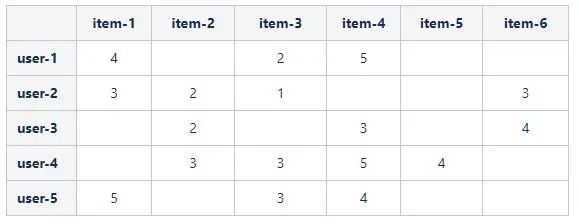 例如,在上面的表格中,用户user-1购买了物品 item-1, item-3, item-4,并且分别给出了4,2,5的评分。最终,我们将原问题转化为预测白色空格处的数值。