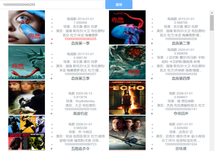 我们用《血族第一部》在向量库 (存储向量的数据库,该系统能够根据输入向量,用相似度公式在库中进行检索,找出TopN的候选向量) 里面进行相似度检索,找到了前7部高相似度的影片,值得注意的是第一部是自己本身,相似度为1.0,其他三部是《血族》的其他3部同系列作品。