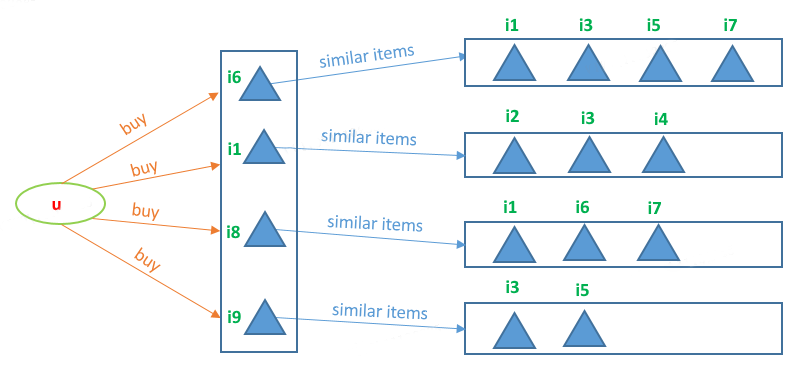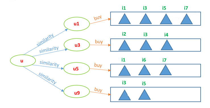 例如,由用户u的相似用户{u1, u3, u5, u9}可得候选物品为