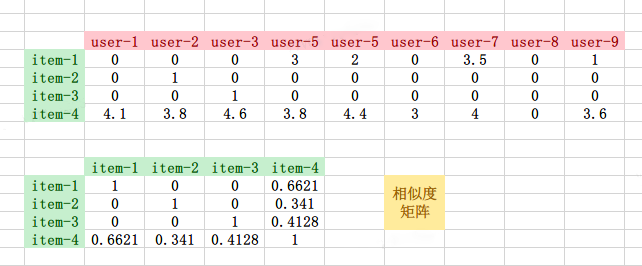 我们从评分矩阵中抽取item1 - item4的向量,并且利用余弦相似度计算它们之间的相似度。