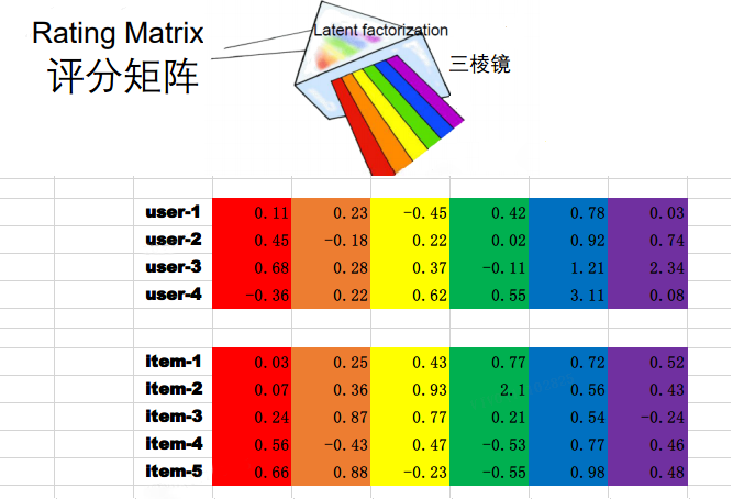其中, k≪m/n 表示隐性因子,以用户侧来理解,k=2 表示的就是用户的年龄和性别两个属性。此外有个很好的比喻就是物理学的三棱镜,白光在三棱镜的作用下被分解为7种颜色的光,在矩阵分解算法中,分解的作用就类似于"三棱镜",如下图所示,因此,矩阵分解也被称为隐语义模型。矩阵分解将系统的自由度从 O(mn) 降到了O((m+n)k,从而实现了降维的目的。