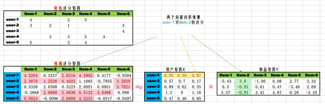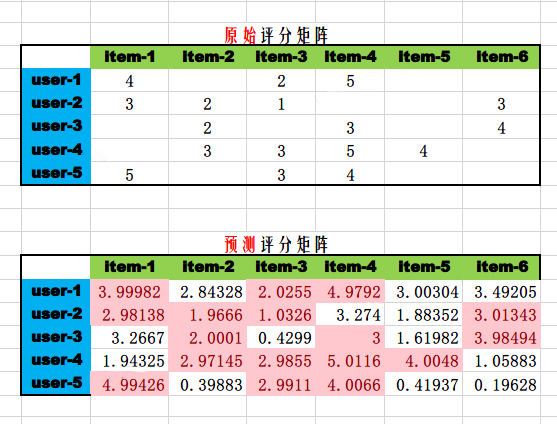 # Xarray([[1.30678487, 2.03300876, 3.70447639],[4.96150381, 1.03500693, 1.62261161],[6.37691007, 2.4290095 , 1.03465981],[0.41680155, 3.31805612, 3.24755801],[1.26803845, 3.57580564, 2.08450113]])# Yarray([[ 0.24891282, 1.07434519, 0.40258993],[ 0.12832662, 0.17923216, 0.72376732],[-0.00149517, 0.77412863, 0.12191856],[ 0.12398438, 0.46163336, 1.05188691],[ 0.07668894, 0.61050204, 0.59753081],[ 0.53437855, 0.20862131, 0.08185176]])# X.dot(Y.T) 预测评分array([[4.00081359, 3.2132548 , 2.02350084, 4.9972158 , 3.55491072, 1.42566466],[3.00018371, 1.99659282, 0.99163666, 2.79974661, 1.98192672, 3.00005934],[4.61343295, 2.00253692, 1.99697545, 3.00029418, 2.59019481, 3.99911584],[4.97591903, 2.99866546, 2.96391664, 4.99946603, 3.99816006, 1.18076534],[4.99647978, 2.31231627, 3.02037696, 4.0005876 , 3.5258348 , 1.59422188]])# 原始评分矩阵array([[4, 0, 2, 5, 0, 0],[3, 2, 1, 0, 0, 3],[0, 2, 0, 3, 0, 4],[0, 3, 3, 5, 4, 0],[5, 0, 3, 4, 0, 0]])