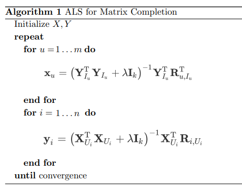 总结来说,ALS的整个算法过程只有两步,涉及2个循环,如下图所示: