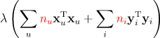 因为向量 xu与求和符号 ∑i∈Iu无关,所有将其移出求和符号,因为 xTuyiyTi 是矩阵相乘 (不满足交换性),因此 xu 在左边